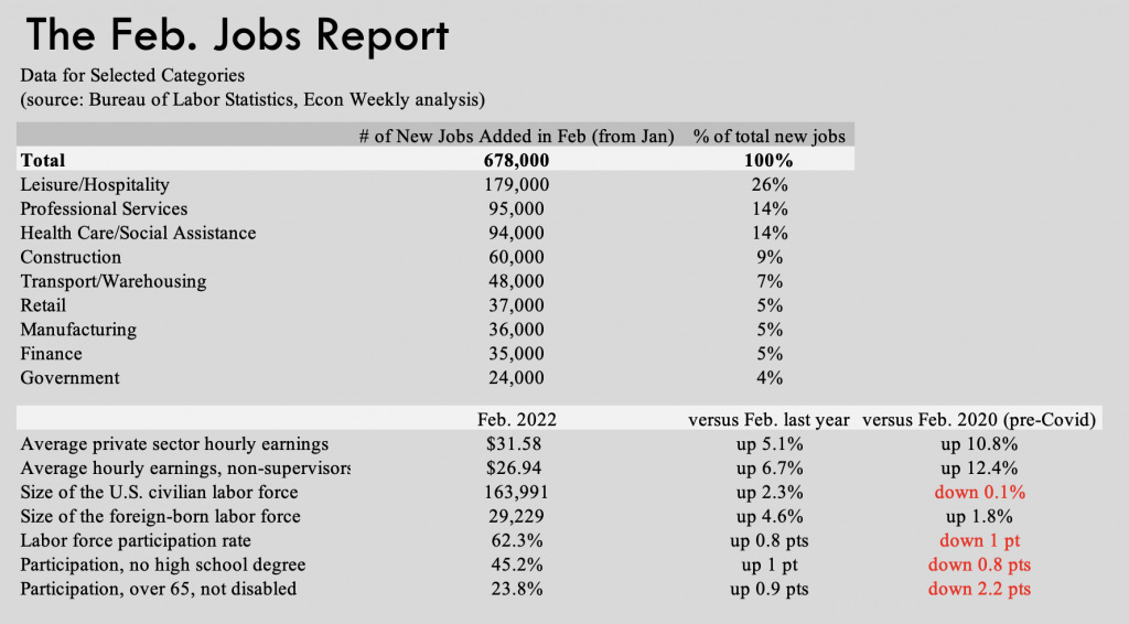 Yet in other ways, it feels like the best of times. Another spectacular jobs report makes clear that America’s economy is firing on all cylinders, except ironically enough, in the area associated with cylinders—the auto sector lost 18,000 jobs in February. But don’t dwell on that (it’s a semiconductor thing). More importantly, the economy created 678,000 new jobs in February, following revised totals of 481,000 in January and 578,000 in December. Rarely if ever has there been such torrid job creation. Still though, the total number of people working in America remains 2.1m fewer than just before the pandemic. Labor participation, though trending up in recent months, is still down from pre-pandemic times. For seniors, many opting for earlier retirement, participation is down by more than two full points.