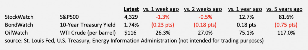 Last week, oil prices (WTI) jumped an astonishing 26%, reaching $116 per barrel. In nominal terms anyway, that’s higher than they ever went during the early 2010s. In fact, they haven’t been that high since the summer of 2008. For the U.S., remember, the early 2010s was a time of frustratingly sluggish economic growth. The summer of 2008, recall, was the final moment of calm before the ruinous housing and financial collapse symbolized by the fall of Lehman Brothers. For Americans, indeed, spiking oil prices go hand in hand with the worst of times.